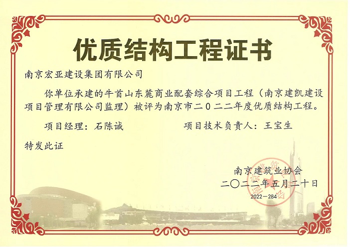 (2022年05月20日)牛首山東麓商業(yè)配套綜合項目榮獲《南京市2022年度優(yōu)質(zhì)結(jié)構(gòu)工程》