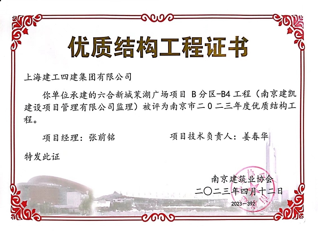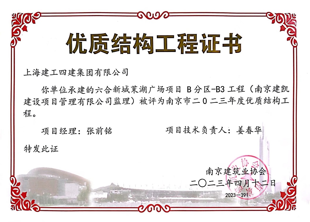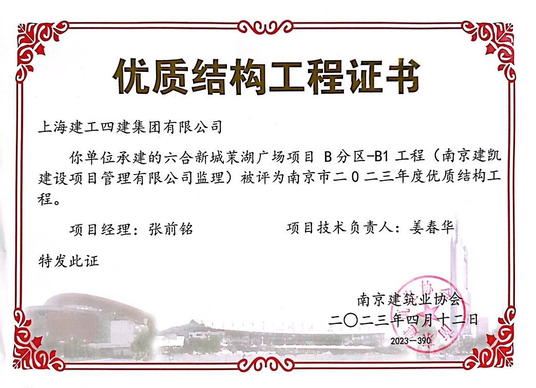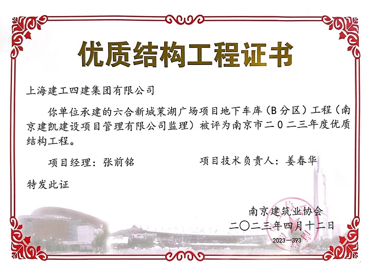 六合新城茉湖廣場項目榮獲“2023年度優(yōu)質(zhì)結構工程”